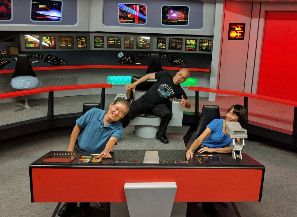 TREK STAR. (09/24/25). Pictured (L-R) Michael Okuda, Doug Drexler, and Denise Okuda. On the replica Enterprise bridge set, at the Star Trek Original Series Set Tour in Ticonderoga, New York.